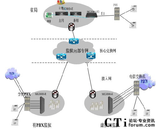在有PBX監(jiān)獄部署智能路由網(wǎng)關(guān)MG3000-R32(或者數(shù)字中繼網(wǎng)關(guān)MG3000-T4),網(wǎng)關(guān)通過10/100Base-T以太網(wǎng)接口連接IP網(wǎng)絡(luò),注冊到軟交換平臺通過路由匯接,成功的把全省各監(jiān)獄的內(nèi)部電話互連互通起來。