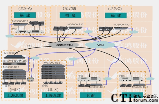 - 上海接入采用電信30B+D線路兩條。使用2E1的MG3000-T4設(shè)備接入。上海南區(qū)IP分機600門,北區(qū)IP分機300門,全部采用MG3000-R32(32FXS)設(shè)備做接入。福建龍巖A、B、C,江西高安,河南鄭州這5個分支分別采用16FXO口網(wǎng)關(guān)與PBX或電信虛擬網(wǎng)直線互聯(lián)。