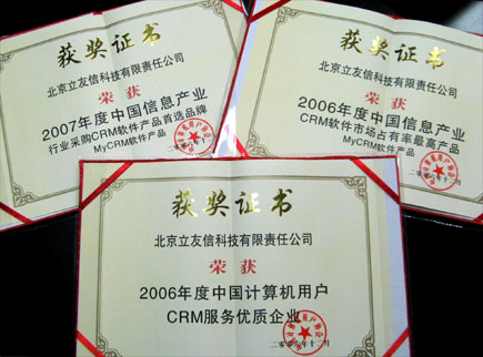 2007年1月16日,中國計算機用戶協(xié)會在京召開隆重而盛大的年度頒獎儀式。MyCRM在本次會上榮獲殊榮,一舉囊括了“2006年度中國信息產(chǎn)業(yè)CRM 軟件市場占有率最高產(chǎn)品”,“ 2006年度中國計算機用戶CRM服務優(yōu)質(zhì)企業(yè)”和“2007 年度中國信息產(chǎn)業(yè)行業(yè)采購CRM軟件產(chǎn)品首選品牌”。本次獲獎充分體現(xiàn)了MyCRM在CRM市場的全面領(lǐng)先優(yōu)勢。