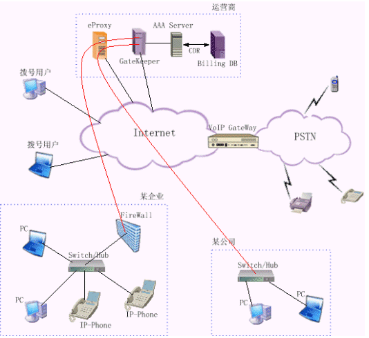 運(yùn)營級IP電話解決方案為運(yùn)營商提供一種可靠經(jīng)濟(jì)的VoIP接入平臺與VoIP骨干網(wǎng)互連,這種方式可以充分利用網(wǎng)絡(luò)資源,降低用戶服務(wù)價(jià)格,提高運(yùn)營商的競爭力。它為用戶提供了多種業(yè)務(wù)類型,除了可以實(shí)現(xiàn)任意兩點(diǎn)間的PC互通外,還可以實(shí)現(xiàn)PC通過VoIP網(wǎng)關(guān)與PSTN用戶間的互聯(lián)互通。