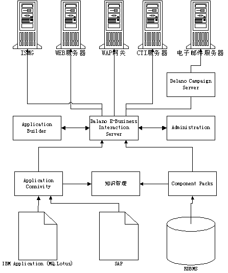 訪問(wèn)層:訪問(wèn)層包含Delano Campaign Server和Delano e-Business Interaction Suite。通過(guò)訪問(wèn)層,利用現(xiàn)有的電子渠道與客戶交流,完成企業(yè)所制定的客戶關(guān)照流程。