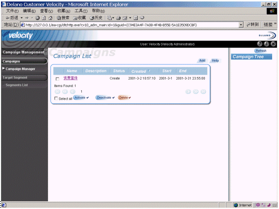易虹德龍(Delano),所提供的Custoemr Velocity滿足了CRM用戶在電子營(yíng)銷方面的需求。在這個(gè)平臺(tái)上,CRM系統(tǒng)用戶,可以通過WEB界面,輕松地針對(duì)客戶分組制定和管理所有市場(chǎng)活動(dòng)。這些市場(chǎng)活動(dòng),通過多個(gè)步驟一步一步地抓住客戶的“心”。下圖是使用易虹解決方案進(jìn)行活動(dòng)管理的界面: