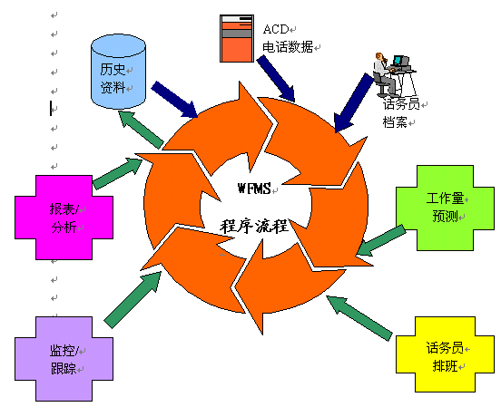 如上面所描述的WFMS流程,最初開始于歷史的電話信息、目前的ACD數(shù)據(jù)和服務代表的簡介。從這些綜合的信息,做出對工作量的預測,從而從本質(zhì)上決定了配備給呼叫中心的服務代表數(shù)量。了解了服務代表的需求數(shù)量,一個適用于任何時間段的工作時間表就可以產(chǎn)生了,包括每天的,每周的,每月的;谶@一點,主管人就可以監(jiān)控服務代表的行為,追蹤來電,并分析不同種類的來電分組,做出應對假定情景的方案,從而產(chǎn)生各種各樣的報告和圖表。