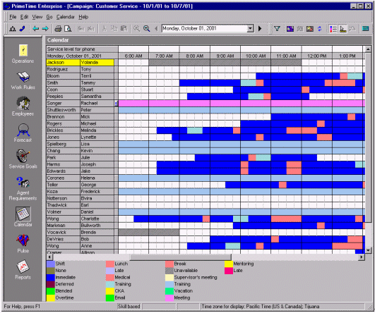 絕大多數(shù)的WFMS可以通過歷史數(shù)據(jù)和人員情況自動(dòng)生成排班表。而且它也只是簡單的根據(jù)呼叫中心的運(yùn)營時(shí)間來排班。舉個(gè)例子,某個(gè)呼叫中心在排班是有兩個(gè)班,一個(gè)工作時(shí)間是早7點(diǎn)到下午3點(diǎn),另一個(gè)是早九點(diǎn)到晚五點(diǎn),這就意味著不僅要安排早、晚休息,還要顧及到午休的時(shí)間。休息的安排要保證能夠在電話的持續(xù)中也能有持續(xù)的人員保證電話量。在這個(gè)自動(dòng)化軟件的之中還有一個(gè)因素要能夠?qū)崿F(xiàn)自動(dòng)化--人的因素。例如:Mary和Jane想同時(shí)去吃午餐,然而自動(dòng)化的排班表并不是這樣的。然而主管根據(jù)當(dāng)時(shí)的話務(wù)量情況和工作狀況以及工作規(guī)范批準(zhǔn)了Mary和Jane共享午餐的要求,而WFMS就要能夠處理這樣很有可能發(fā)生,而且是合理的情況。排班表的更改應(yīng)該就是簡單的拖拽圖標(biāo)就應(yīng)該能夠?qū)崿F(xiàn)的功能,并且能夠在這種更改會(huì)對(duì)預(yù)測(cè)的話務(wù)量差生不好影響時(shí),拒絕這種拖拽行為。