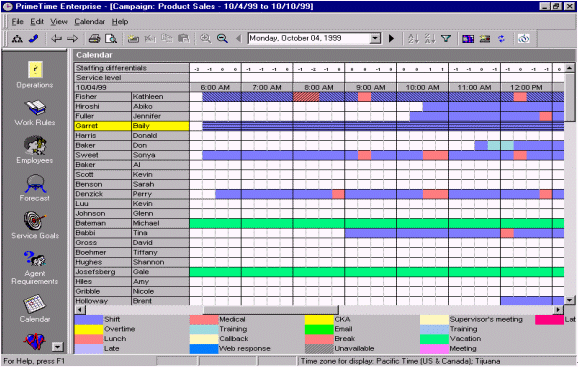 人員預(yù)測(cè)是一個(gè)每天、每周、每月、每年都需要作的工作計(jì)劃,為了能夠平衡呼叫中心人員的工作量和人員的可用性。通過將歷史數(shù)據(jù)和人員數(shù)據(jù)整合、加以分析,并借以WFMS體現(xiàn)出分配多少員工就可以達(dá)到既定的服務(wù)水準(zhǔn)。一旦需要員工數(shù)量被估算出來,那么工作安排也就是每天、每周、每月、每天的排班表的輪廓也就出來了。絕大多數(shù)的WFMS軟件的界面和操作都很相似,最主要的就是內(nèi)容就是要包含員工的姓名、員工的工作時(shí)間、員工的其他日程(最小單位是15分鐘),并且能夠提供具有多個(gè)管理軟件接口,和多種不同的管理方式。圖9.就是一個(gè)典型的人員排班表,以15分鐘為單位體現(xiàn)人員的工作安排。附加選項(xiàng)還可以包含"休假""遲到""曠工"等等,并且這排班表還可以通過歷史數(shù)據(jù)體現(xiàn)出哪個(gè)時(shí)段可能出現(xiàn)人員不足哪個(gè)時(shí)段容易出現(xiàn)人員過,F(xiàn)象。