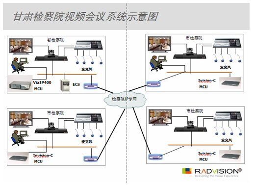 為進一步提高檢察系統(tǒng)的工作效率,甘肅省人民檢察院已經(jīng)在其現(xiàn)有網(wǎng)絡(luò)的基礎(chǔ)上建設(shè)覆蓋全省范圍的檢察院專用網(wǎng),并致力于在網(wǎng)絡(luò)內(nèi)建成集領(lǐng)導(dǎo)決策、業(yè)務(wù)處理、信息通訊等為一體的信息管理與服務(wù)的綜合業(yè)務(wù)系統(tǒng)和信息系統(tǒng)資源庫,從而建立起一整套可確保全省人民檢察院工作信息化實施和發(fā)展的機制,提高全省檢察機關(guān)的辦公、辦案效率,為檢察機關(guān)全面履行法律賦予的職能提供技術(shù)保障。RADVISION視頻會議系統(tǒng)正是這個宏大計劃的重要組成部分。