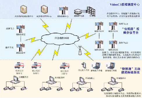 C3I視頻應急指揮協(xié)同系統(tǒng)在政府IP網(wǎng)絡(luò)中處于城市的神經(jīng)中樞。它將政府各個部門、單位聯(lián)系成為一個整體。在C3I視頻應急指揮協(xié)同系統(tǒng)的前端,由"快照通"無線視頻傳輸系統(tǒng)對政府所屬各個單位進行實時監(jiān)控,時刻掌握現(xiàn)場動態(tài),該部分支持固定點監(jiān)控,也支持移動指揮點和無線移動接入終端,保證了前方工作的靈活、機動性;在系統(tǒng)的指揮中心部分,由VideoC3指揮調(diào)度中心來支持,它一方面需要對前端的監(jiān)控信息進行控制,同時,要對整個政府進行綜合管理調(diào)度,在發(fā)生突發(fā)狀態(tài)的時刻,現(xiàn)場前端"快照通"捕獲的相應信息通過C3I系統(tǒng)平臺,迅速傳遞至指揮中心部分,政府管理人員通過VideoC3指揮調(diào)度中心對前端進行遠程指揮,在第一時間緊急處理現(xiàn)場突發(fā)事件;在整個C3I系統(tǒng)中,政府各個部門、單位之間通過"快視通"視頻會議平臺進行辦公交流,支持各部門間的協(xié)同辦公,同時,也可以通過其實現(xiàn)對所屬區(qū)域的指揮調(diào)度。