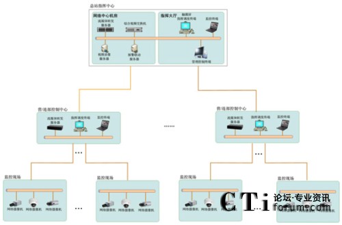 系統(tǒng)采用基于網(wǎng)絡(luò)的分布式控制結(jié)構(gòu),通過通信樓專網(wǎng)連接各機(jī)房和各營等現(xiàn)場監(jiān)控點(diǎn)。分為通信樓一級指揮調(diào)度平臺(tái),營二級指揮調(diào)度平臺(tái),結(jié)構(gòu)如下圖。