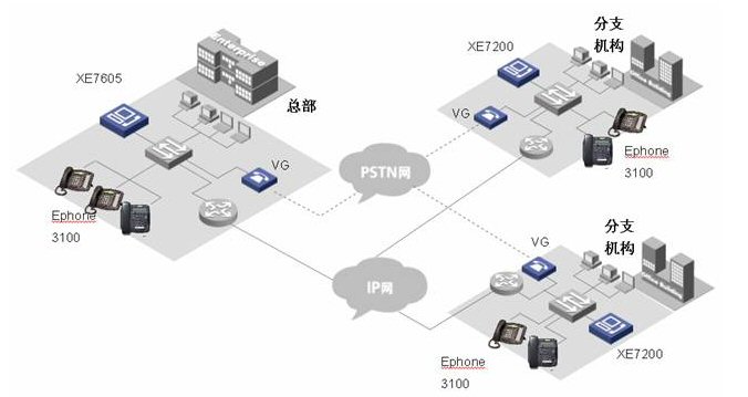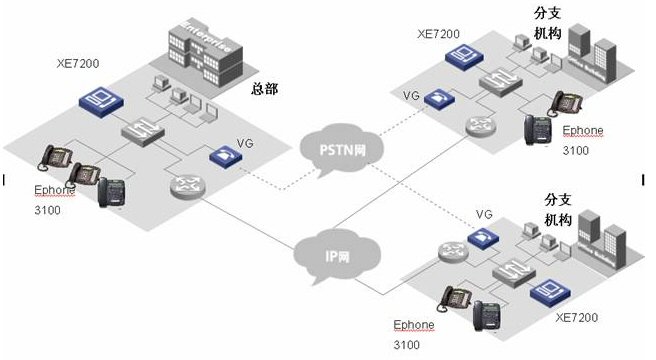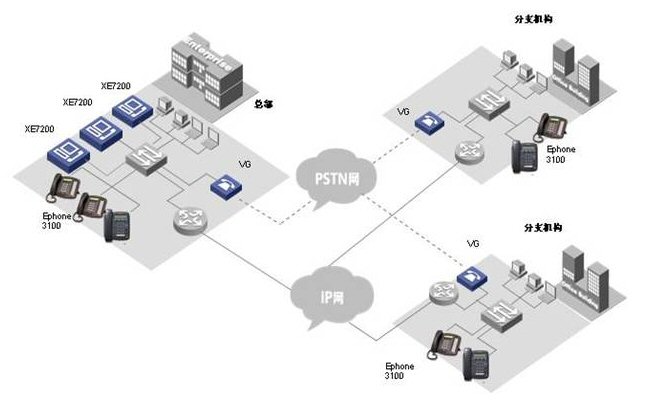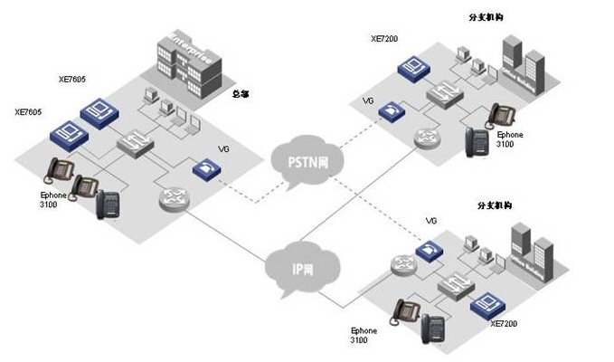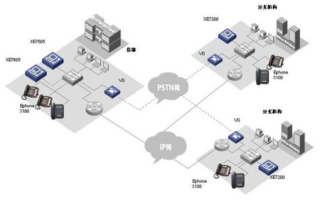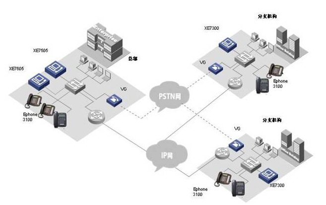 各小分支機(jī)構(gòu)的IP語(yǔ)音終端可以直接注冊(cè)到本地XE 7000上, 從而實(shí)現(xiàn)整網(wǎng)的分布式部署。