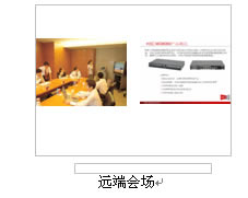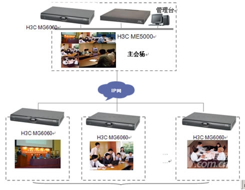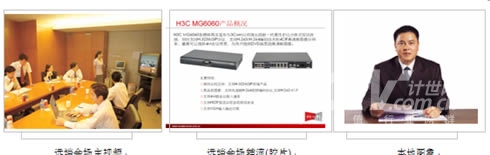 在主會(huì)場(chǎng),分會(huì)場(chǎng)的會(huì)議室配備H3C高清視訊終端MG6060。H3C MG6060終端支持H.263、H.264等視頻編解碼協(xié)議,并采用了專有的視頻前、后處理技術(shù),使得圖像質(zhì)量大大提升,在周圍環(huán)境光照較差或者會(huì)場(chǎng)顏色搭配不甚和諧的情況下,仍舊能夠得到清晰、自然的圖像。視頻功能主要特色功能包括動(dòng)態(tài)4CIF高清圖像、H.239雙視頻流傳送、畫中畫(PIP)、雙屏顯示、分屏顯示、VGA輸入、VGA輸出、桌面?zhèn)魉、圖像屏蔽、圖像參數(shù)調(diào)整等。有關(guān)H3C
