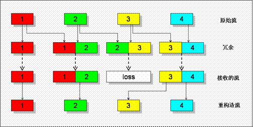 當(dāng)?shù)?個包在傳輸過程中丟失時,由于包“3”被冗余編碼到第4個傳輸包中,在對端接收到碼流后還可以正常重構(gòu)出包“3”。