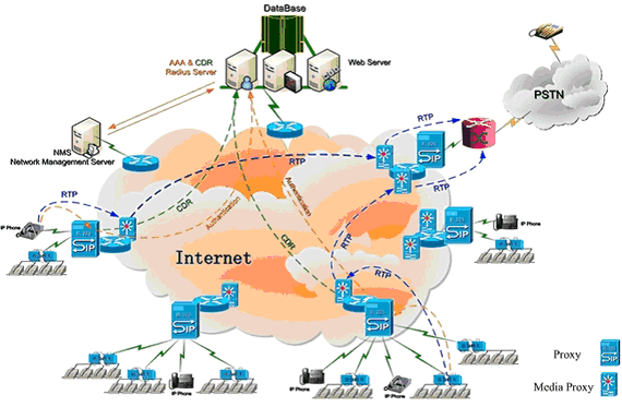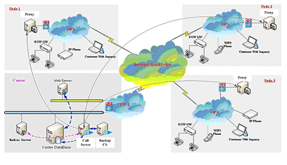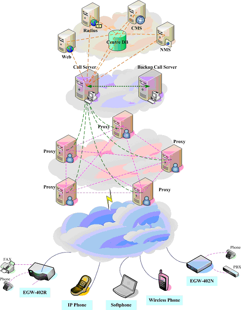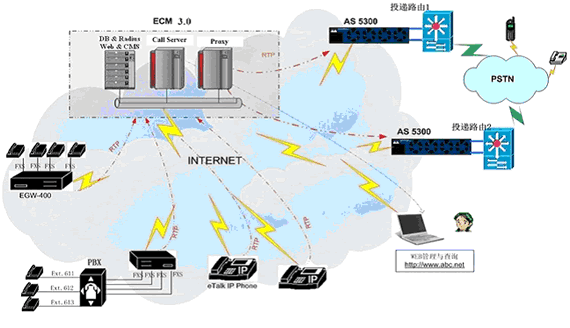 無(wú)論大型企業(yè)用戶(通過(guò)PBX接入網(wǎng)關(guān)設(shè)備)、小型企業(yè)用戶(使用網(wǎng)關(guān)設(shè)備)還是其它使用單口網(wǎng)關(guān)或IP Phone的用戶,都可以通過(guò)各種接入方式接入到ECM3.0網(wǎng)絡(luò)中,并通過(guò)PROXY及MEDIA