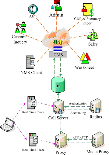 系統(tǒng)管理員通過(guò)Web和CMS對(duì)用戶進(jìn)行管理,并通過(guò)CS和PROXY所帶的網(wǎng)管功能(NMS)進(jìn)行實(shí)時(shí)的網(wǎng)絡(luò)監(jiān)控及維護(hù),及時(shí)診斷并處理故障。