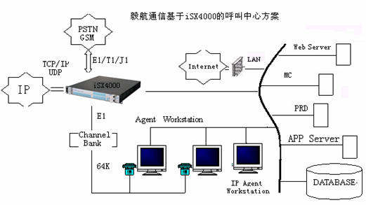 相對于現(xiàn)在的兩種主流呼叫中心方案,毅航通信基于iSX4000呼叫中心解決方案直接整合了Internet的接入。傳統(tǒng)由IVR完成的操作也可以通過Web頁面上的流程實現(xiàn),這樣用戶通過下拉菜單、簡單填寫、點擊按鈕等操作完成客戶識別、業(yè)務(wù)識別等操作,這些流程完成后,通過VoIP對呼叫中心呼入,由呼叫中心對呼入進行受理,再按照相應(yīng)的原則分配到座席,座席再作相應(yīng)的應(yīng)答和處理,從而為客戶提供了一個通過Web站點直接進入呼叫中心的途徑,把Internet所具有的豐富信息資源和強大的功能賦予呼叫中心,它向客戶提供一個可訪問的Web站點,使得呼叫中心從“撥叫到交談(Dial to Talk)”發(fā)展到“點擊到交談(Click to Talk)”,通過Internet可以提供IP電話語音呼叫、Call Back、IP傳真、IM、E-mail等功能,擴展了通信渠道,一方面用戶可以實現(xiàn)免費接入到呼叫中心,另一方面企業(yè)能夠向更多的客戶提供優(yōu)質(zhì)、方便的服務(wù)資源,而且由于這些資源的價格相對傳統(tǒng)通信便宜,使企業(yè)為客戶提供全國、乃至于全球服務(wù)成為可能,提高了企業(yè)客戶服務(wù)水平,增強了企業(yè)競爭力。毅航通信統(tǒng)一呼叫中心解決方案系統(tǒng)結(jié)構(gòu)如圖所示: