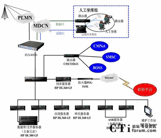 平臺核心話路接入集在中毅航通信iSX4000智能業(yè)務(wù)交換機(jī)的IVR自動語音平臺,人工坐席平臺通過和系統(tǒng)支撐軟件實(shí)現(xiàn)遠(yuǎn)端坐席功能,通過專線中繼與IVR平臺實(shí)現(xiàn)話路連接;InterNet與IVR平臺實(shí)現(xiàn)數(shù)據(jù)同步。根據(jù)移動交換網(wǎng)傳輸內(nèi)容選擇應(yīng)相的IVR自動語音服務(wù)或人工坐席服務(wù)。