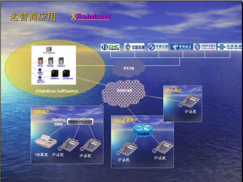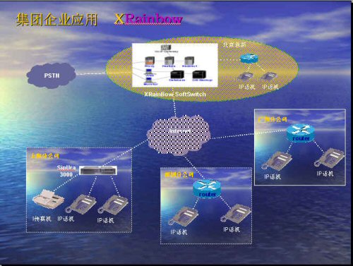 。。首先我們需要這4個地點都有自己的網(wǎng)絡接入,最好是寬帶。以北京總部為列,如果將Xrainbow系統(tǒng)放在北京總部,這就需要北京總部這邊有一個固定IP地址的網(wǎng)絡接入,其他分公司不需要固定ip地址,只要可以上網(wǎng)就可以登錄到北京總部的Xrainbow系統(tǒng)。這樣企業(yè)與分支機構(gòu)之間就實現(xiàn)了零話費,同時還可以提供傳真業(yè)務。另外終端設(shè)備可以隨意移動,只要可以上網(wǎng)的地方就可以接入我們的終端設(shè)備,免去了因公司的發(fā)展或者搬動而要去申請初裝大量電話的煩惱。