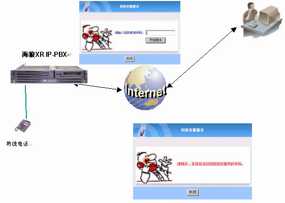 如圖:用戶在上網(wǎng)訪問企業(yè)網(wǎng)站的時(shí)候,如果需要和企業(yè)進(jìn)行聯(lián)系,手邊沒有麥克風(fēng),就可以使用企業(yè)在網(wǎng)頁上的CALL-BACK800鏈接,點(diǎn)擊后就彈出一個(gè)窗口,然后輸入身邊的座機(jī)或者手機(jī)號碼,點(diǎn)擊開始服務(wù),窗口出現(xiàn)紅色的"請稍候,系統(tǒng)將自動回?fù)艿侥峁┑奶柎a" ,稍等一會后,用戶的電話就會被呼叫,接通后就可以和企業(yè)的熱線電話進(jìn)行溝通。可以實(shí)現(xiàn)和WEB800同樣的效果,但是CALL-BACK800相對用戶來說是一個(gè)更方便的溝通方式。