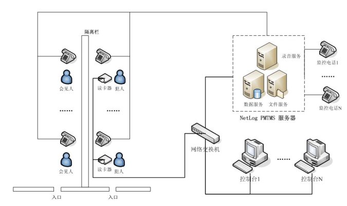 NetLog PMTMS會(huì)客室電話管理系統(tǒng)采用基于分布式、多層控制管理體系的設(shè)計(jì)思想,將電話線路與內(nèi)部網(wǎng)絡(luò)有效地結(jié)合在一起,形成一套完整管理系統(tǒng),包括會(huì)見(jiàn)監(jiān)控、通話錄音、數(shù)據(jù)管理。