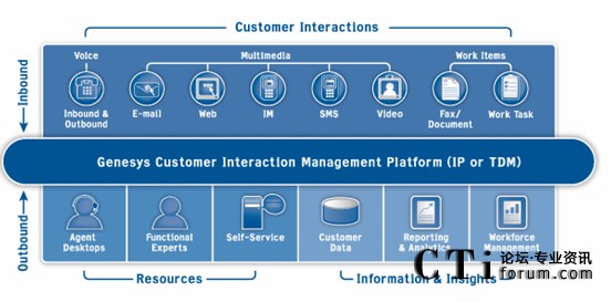 Genesys Customer Interatcion Management Platform是一個開放、可擴充、有彈性的客戶管理交互平臺。它是建構(gòu)客服中心的核心 ,所有Genesys解決方案模塊 ,包含企業(yè)智能路由(Enterprise Routing Solution)、智能網(wǎng)端智能路由(Network Routing Solution)、外撥解決方案(Outbound Contact Solution)、互聯(lián)網(wǎng)解決方案(Internet Contact Solution)、勞動力管理方案(Workforce Management Solution)等等都是建構(gòu)在Genesys的基礎(chǔ)平臺之上。使得Genesys所有的模塊都可充份整合在一起 ,提供客戶全方位、全功能的企業(yè)交互解決方案。