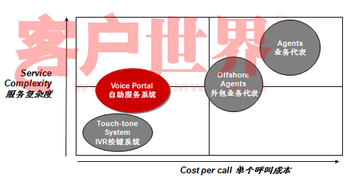 讓我們來(lái)看看這張圖。這張圖縱軸是服務(wù)的復(fù)雜度,橫軸是單位呼叫成本,傳統(tǒng)的IVR(觸鍵的語(yǔ)音IVR)和人工服務(wù)相比,服務(wù)的復(fù)雜度可就差多了。而Voice Portal的概念是用比較少的成本做更多的業(yè)務(wù),從成本上講比原來(lái)的傳統(tǒng)的IVR可能成本稍微高一點(diǎn)點(diǎn),但是和人工服務(wù)相比,無(wú)論是和單位自建呼叫中心座席比,還是和外包呼叫中心座席比,成本都有很大降低,但業(yè)務(wù)復(fù)雜度可以做得比傳統(tǒng)IVR復(fù)雜很多。我們承認(rèn),就提供服務(wù)的內(nèi)容來(lái)講,Voice Portal今天仍然不能夠像人工那樣提供那么全面的服務(wù),但是可以涵蓋很多服務(wù)內(nèi)容,在這方面一是因?yàn)榧夹g(shù)先進(jìn)了,另一方面也在于引導(dǎo)。今天我看到越來(lái)越多的客戶已經(jīng)開(kāi)始有意識(shí)的推行自助服務(wù)形式。我前幾年去新加坡打出租,發(fā)現(xiàn)在新加坡有很多叫出租的車站,車站上有一個(gè)按鍵,按鍵上有一個(gè)編碼,說(shuō)明你在什么位置,當(dāng)你打通出租車客服的電話,你只要告訴這個(gè)編碼,他們就自然而然知道你在什么地方,并把要來(lái)接你的車車牌號(hào)通過(guò)語(yǔ)音報(bào)讀方式通知你。今天在中國(guó)也開(kāi)始有這種形式了。昨天我沒(méi)有開(kāi)車,也算是支持北京市每周少開(kāi)一天車的號(hào)召,我打了出租,在和出租司機(jī)聊天的過(guò)程中,出租司機(jī)說(shuō)現(xiàn)在油價(jià)很貴,他們有很強(qiáng)烈的需求不愿意掃馬路,他們也有一個(gè)出租車叫車電話,那個(gè)呼叫中心大概有上百個(gè)坐席,這個(gè)公司有一萬(wàn)六千輛出租車在北京,由他們來(lái)進(jìn)行搶答,搶答完之后你可以告訴說(shuō)這個(gè)人在什么地方等,唯一不同的我們?cè)谧灾线沒(méi)有做得那么到位,司機(jī)搶到了活還要給客戶打一個(gè)電話,不象新加坡完全是自助的,你只要按了那個(gè)鍵,系統(tǒng)就知道你在什么地方,當(dāng)尋找到合適的車的時(shí)候,語(yǔ)音報(bào)讀你車牌號(hào)就行了。我和說(shuō)出租車師傅,那你打電話成本不是增加了嗎,他一笑,增加打一個(gè)電話的成本怎么也比掃馬路強(qiáng)。大家可以看看呼叫中心多有用,自助服務(wù)能省多少錢。