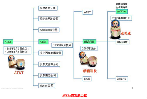 Avaya的歷史最早可以追溯到1885年成立的美國電話電報公司(AT&T),AT&T在1994年一分為AT&T、朗訊科技、NCR等三家公司,而Avaya于2000年10月從朗訊科技的企業(yè)通信部門剝離獨立上市(代碼AV),再后來即上文中提到的Avaya被兩大私募德州太平洋集團和銀湖合伙組成的財團用82億美元私有化。