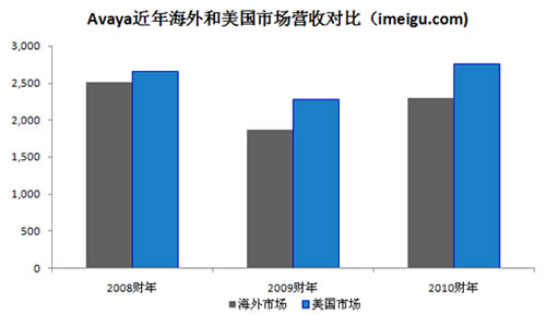 2008、2009、2010財年Avaya總營收分別為49.23億美元、41.50億美元、50.60億美元,2009財年營收受宏觀經(jīng)濟(金融海嘯)因素影像而出現(xiàn)15.7%的下降,2010財年Avaya公司收購原北電的企業(yè)通信部門(NES),受此合并報表影響和經(jīng)濟復蘇因素,2010財年營收相比2009財年增長21.9%。