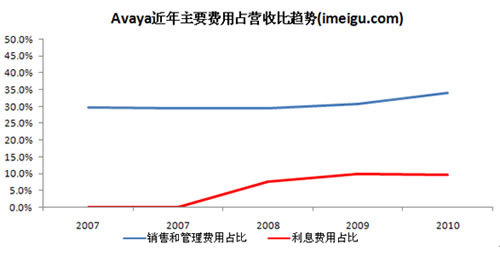 銷售和管理費用以及利息費用是Avaya開支最大的兩塊費用,管理和銷售費用一直穩(wěn)定在30%左右。Avaya私有化之前的2006、2007財年的利息費用分別為300萬美元、100萬美元(對應著51.48億美元和52,78億美元的營收),利息費用占比不到1%,私有化之后利息費用急劇飆升(私有化相關債務的增加),2008、2009、2010財年利息費用分別為3.77億美元、4.09億美元、4.87億美元,成為束縛Avaya盈利的關鍵因素。