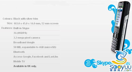 這款新的Skypephone S2內(nèi)置了Skype,可以通過Skype來享受更加便宜的話費(fèi),同時(shí)該機(jī)也內(nèi)置了Google和Facebook手機(jī)客戶端,可以便捷訪問。這款機(jī)器采用了黑色與銀色搭配,手機(jī)機(jī)身尺寸為103.0×45.0×14.0mm,支持HSDPA技術(shù),支持手機(jī)電視功能,支持藍(lán)牙,手機(jī)搭載了一枚320萬像素?cái)z像頭,機(jī)身有約50MB內(nèi)存,支持?jǐn)U展,最高到4GB。比較遺憾的是該機(jī)目前只有在英國有售。