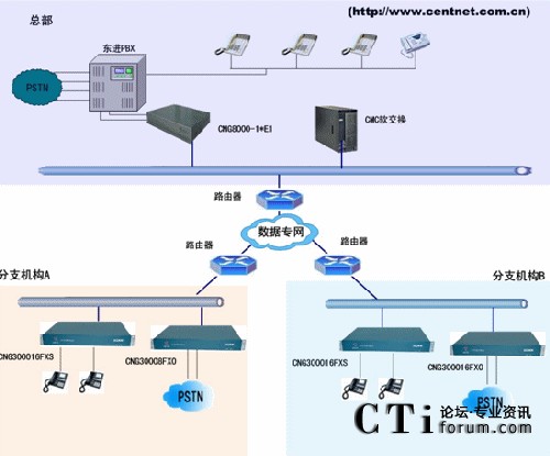方案組網(wǎng)說明:通過呼叫中心服務(wù)器E1接口連接數(shù)字中繼CNG8000-1*E1, 遠程座席接CNG3000-XFXS