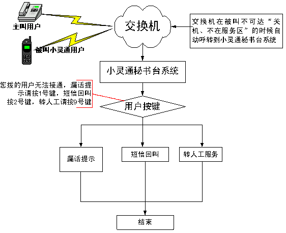 當主叫用戶撥打被叫小靈通用戶,而被叫小靈通用戶處于不可達(關(guān)機、忙、不在服務(wù)區(qū))狀態(tài)時,該呼叫自動轉(zhuǎn)入轉(zhuǎn)到小靈通秘書臺系統(tǒng)后,用戶選擇短信回叫,系統(tǒng)在被叫小靈通用戶空閑后,會發(fā)送短信通知主叫用戶,被叫已經(jīng)恢復狀態(tài),可以呼叫。