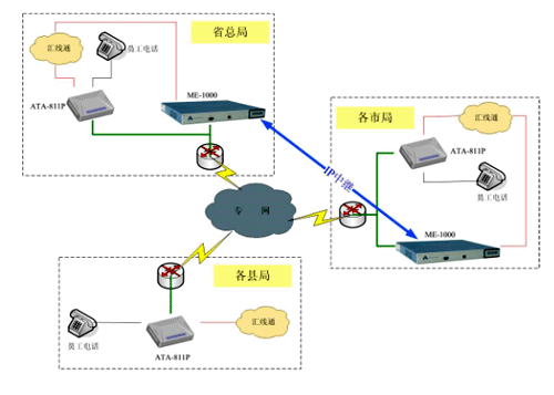 由于用戶數(shù)量較大,我們建議采取分級管理方式,利用我們Anta科技(北京)有限公司Simplicity 系列IP-PBX產(chǎn)品的靈活性,在每個(gè)市局放置一臺ME-1000型號的IP-PBX,管理市局及下屬縣區(qū)局的電話系統(tǒng);省總局放置一臺ME-1000,管理總局電話系統(tǒng);同時(shí)各市局的ME-1000向總局注冊,形成IP中繼連接,組成全省互通的IP電話管理系統(tǒng)。在終端方面,我們建議采用單端口的ATA-811P桌面型語音網(wǎng)關(guān)連接話機(jī),該網(wǎng)關(guān)通過向IP-PBX注冊,將所有模擬話機(jī)連接到VOIP系統(tǒng)中來。