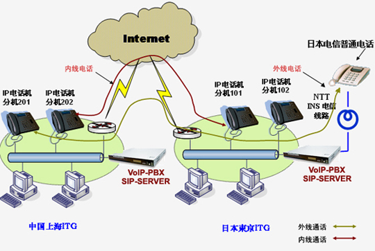 上海愛吉研發(fā)的VoIP-PBX軟交換系統(tǒng)已經(jīng)成功地在上海愛吉和日本愛吉以及日本的客戶間實施。目前應用上海愛吉生產(chǎn)的VoIP-PBX產(chǎn)品,可以實現(xiàn)從上海愛吉的任意IP電話機撥打內(nèi)部分機號,例如:101,成功實現(xiàn)從Internet互聯(lián)網(wǎng)接通位于日本東京的日本ITG或日本OKI公司的IP電話機,而不產(chǎn)生任何的電信費用。另外,目前通過日本的NTTINS 交換機,還實現(xiàn)了從上海愛吉的IP電話機可以撥打日本方面的任意普通電話,即日本電信范圍內(nèi)的任意普通電話,而僅僅產(chǎn)生從日本ITG到日本其它地方的短途或國內(nèi)長途費用,而沒有上海到日本的國際長途費用。具體的網(wǎng)絡應用圖如下所示: