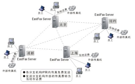 EastFax在國內首次應用中央服務器的方式管理整個集團的傳真。改變以往各個服務器之間一一相連、繁瑣相加的方式,每個服務器只需與中央服務器相連,即加入整個集團傳真網絡。