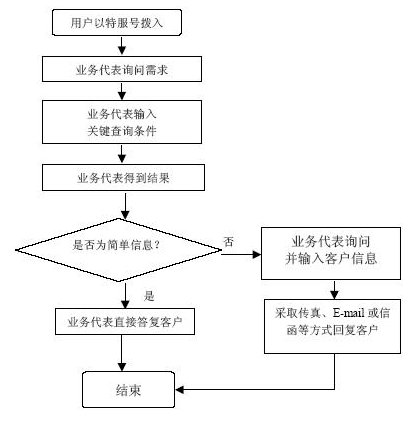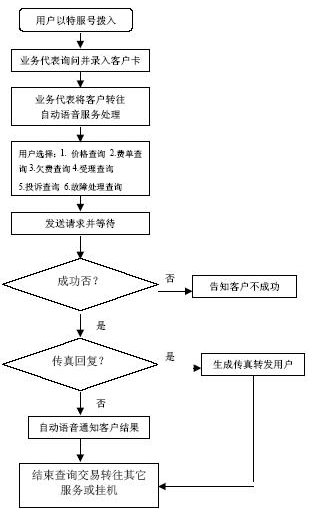 系統(tǒng)自動報受理人員工號,人工交互式受理方式。受理人員根據(jù)用戶要求從服務質量標準數(shù)據(jù)庫、電費數(shù)據(jù)庫和其他相連的數(shù)據(jù)庫查詢資料,然后通過語音方式播報資料或送到用戶指定的傳真機或其他終端設備上。主要內容如下: