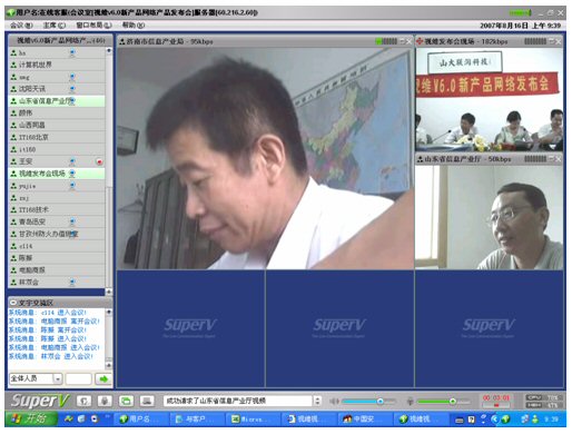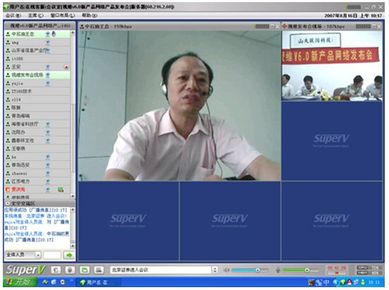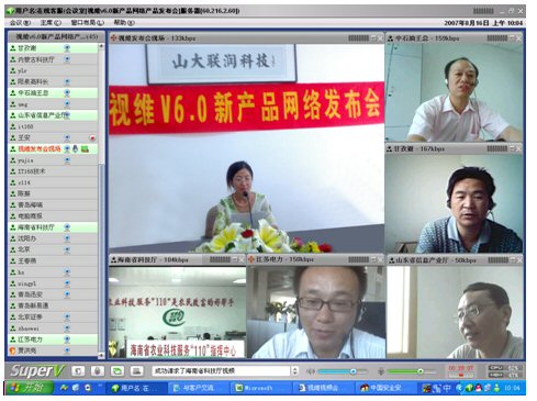 2007年8月16日,視維視頻會議V6.0新產(chǎn)品網(wǎng)絡(luò)發(fā)布會在美麗的泉城濟(jì)南舉行,山東省信息產(chǎn)業(yè)廳、濟(jì)南市信息產(chǎn)業(yè)局的領(lǐng)導(dǎo)、山東省電信等上級主管部門領(lǐng)導(dǎo),視維產(chǎn)品新老用戶和有視頻會議需求的潛在客戶,國內(nèi)外合作伙伴,IT168、中國計算機(jī)報、電腦商報、C114、支點網(wǎng)、計算機(jī)世界、CTI論壇、投影時代等國內(nèi)知名媒體100多人參加了這次網(wǎng)絡(luò)發(fā)布會。在此次會議上,山大聯(lián)潤公司通過視頻會議與各地與會者進(jìn)行了良好的溝通,同時這次發(fā)布會開創(chuàng)了用視頻會議發(fā)布新產(chǎn)品的先河。