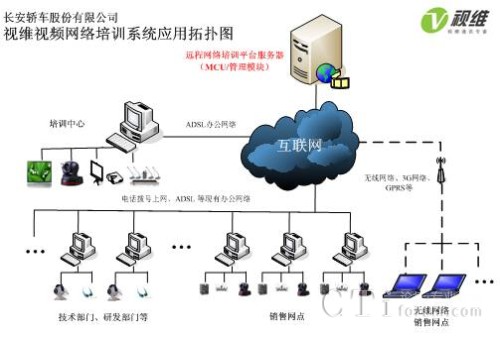 長(zhǎng)安轎車(chē)大規(guī)模網(wǎng)絡(luò)遠(yuǎn)程會(huì)議和培訓(xùn)系統(tǒng)由服務(wù)器端和客戶(hù)端組成,服務(wù)器端軟件部署在重慶中心機(jī)房,中心機(jī)房配置1臺(tái)單獨(dú)服務(wù)器,支持400個(gè)客戶(hù)端同時(shí)在線(xiàn),負(fù)責(zé)所有會(huì)議和培訓(xùn)的召集、音視頻交互、加密等工作,長(zhǎng)安轎車(chē)各部門(mén)、轄下各零售點(diǎn)通過(guò)WEB方式(包括ADSL、3G無(wú)線(xiàn)等多種網(wǎng)絡(luò))即可實(shí)現(xiàn)客戶(hù)端軟件的自動(dòng)安裝與升級(jí),配備簡(jiǎn)單的攝像頭和話(huà)筒之后就可以實(shí)現(xiàn)長(zhǎng)安轎車(chē)以及400多零售點(diǎn)的大規(guī)模工作會(huì)議和高清音視頻網(wǎng)絡(luò)培訓(xùn)。網(wǎng)絡(luò)拓?fù)鋱D如下: