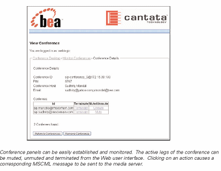 該應用是利用BEA WebLogic workshop編寫的,運行于 BEA WebLogic SIP 服務器上。用戶通過BEA WebLogic門戶提供的圖形界面建立會議。BEA WebLogic SIP 服務器利用SIP協(xié)議與Cantata SnowShore IP Media Server(Cantata SnowShore IP 媒體服務器)進行通信,同時它還使用了MSCML控制媒體處理功能。通過使用XMLBeans, 該應用產(chǎn)生并編譯了MSCML。XMLBeans是一個由BEA公司開發(fā)的開源XML綁定工具。 BEA WebLogic Workshop工具使得開發(fā)人員可以很容易地創(chuàng)建這些通過使用SnowShore 媒體服務器開創(chuàng)的面向Web的SIP和XML接口的融合應用。