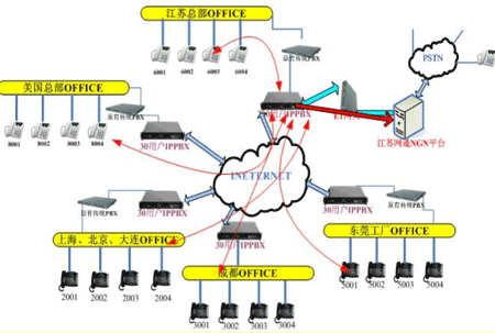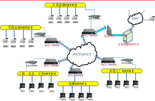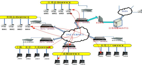 各地的IPPBX會(huì)自動(dòng)識(shí)別輸入的號(hào)碼,并且通過網(wǎng)絡(luò)把號(hào)碼送到蘇州總部的1200交換機(jī),江蘇的1200交換機(jī)已經(jīng)通過E1與江蘇網(wǎng)通的NGN服務(wù)器對(duì)接。網(wǎng)通收到你輸入的被叫號(hào)碼,即發(fā)出呼叫,完成你的一次呼叫。如果有新辦事處成立,只要有網(wǎng)絡(luò),可不用申請(qǐng)當(dāng)?shù)氐碾娫捑路也可實(shí)現(xiàn)輕松辦公。