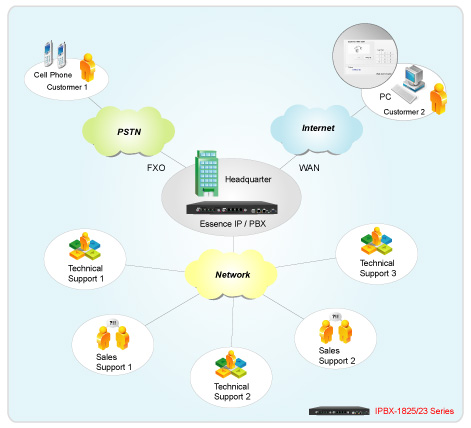 Essence IPBX系列可以注冊者之形式注冊于其他SIP協(xié)定伺服器上,如ITSP運營平臺,或是分公司之小型IP PBX注冊至總公司之大型IP PBX ,均可透過Internet 將話務(wù)無限延伸。