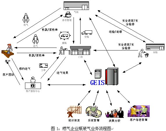 GEIS燃氣運營管理信息系統(tǒng)的應(yīng)用是企業(yè)的長期發(fā)展的驅(qū)動力,它是一套以客戶服務(wù)接觸中心為龍頭、以運營生產(chǎn)流程管理為龍身、以經(jīng)營分析為龍尾的閉環(huán)信息處理系統(tǒng)。它由客戶服務(wù)中心子系統(tǒng)、門市業(yè)務(wù)子系統(tǒng)、氣站管理子系統(tǒng)、安全搶修平臺和管理與集成模塊組成。實踐的事實告訴我們,它起到保持客戶忠誠度、提升企業(yè)品牌影響力、提高業(yè)務(wù)運作效率、加快業(yè)務(wù)經(jīng)營決策和促進企業(yè)持續(xù)發(fā)展的作用。