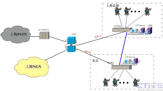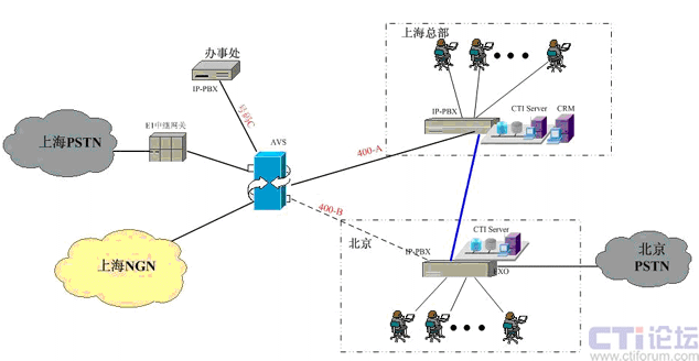 在上海采用傲威通信的AVS軟交換平臺(tái)實(shí)現(xiàn)VoIP呼叫系統(tǒng)的主叫識(shí)別,決定呼叫路由的選定。在上海和北京分別建設(shè)IP-PBX和CTI呼叫系統(tǒng),在各辦事處或分公司可根據(jù)選擇是否要建設(shè)坐席或普通電話系統(tǒng),所有節(jié)點(diǎn)的呼入呼出統(tǒng)一從上海出口實(shí)現(xiàn)出入。
