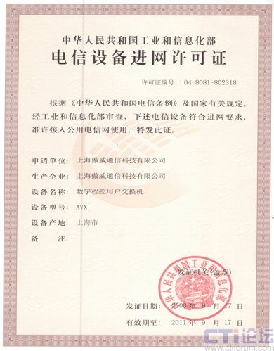 近日,國(guó)內(nèi)知名的VOIP全系列產(chǎn)品和解決方案提供商---傲威通信科技有限公司,自主研發(fā)的AVX系列語(yǔ)音電話交換機(jī)順利通過工業(yè)與信息化部審核,取得“電信設(shè)備進(jìn)網(wǎng)許可證”。此舉標(biāo)志著傲威通信的AVX系列產(chǎn)品已成功取得接入國(guó)家電信網(wǎng)的資質(zhì),為大規(guī)模的推廣應(yīng)用打下了堅(jiān)實(shí)基礎(chǔ)。