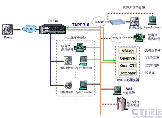 那么如何利用TAPI技術(shù)構(gòu)建現(xiàn)代呼叫中心呢?傳統(tǒng)呼叫中心的做法是每個坐席配一部電話。而采用TAPI 3.0技術(shù),完全不需要每個座席再配一部電話,我們只需一臺電腦終端,配以PC麥克風(fēng)和耳機即可為客戶服務(wù),因為當(dāng)普通電話呼叫轉(zhuǎn)到座席時,語音是經(jīng)過轉(zhuǎn)換壓縮為IP包進行收發(fā)的。我們可以利用TAPI技術(shù)提供的全套API標(biāo)準(zhǔn)函數(shù)來控制CTI的硬件,包括IPPBX或者板卡,來實現(xiàn)這種模式的呼叫中心,并且實現(xiàn)簡單,比較適合在原有系統(tǒng)上的升級換代。