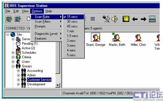 同時(shí)IRIS還可對(duì)座席工作的狀態(tài)進(jìn)行分組實(shí)時(shí)監(jiān)控或監(jiān)聽(tīng)、可直觀的了解的座席的狀態(tài)(離席、入席、電話中、電話待命中、已規(guī)劃中);可對(duì)座席人員進(jìn)行人員跟蹤的實(shí)時(shí)監(jiān)聽(tīng)。