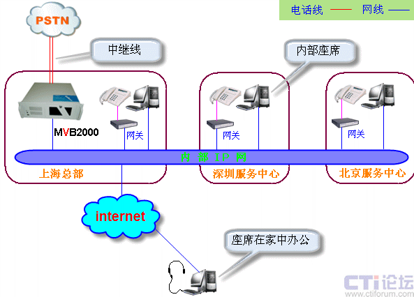 由于底層對VOIP的支持,MVB2000 系統(tǒng)除提供本地人工座席以外,還可以根據(jù)需要接入遠(yuǎn)程座席。主要應(yīng)用形式有(1)接入集中,座席分布;(2)接入分布,座席集中;(3)接入分布,座席分布。