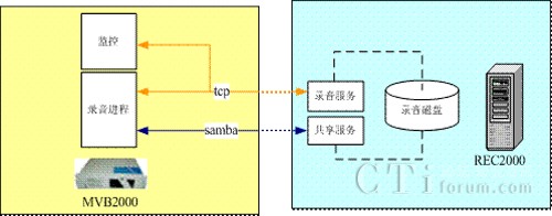 REC2000 是通過網(wǎng)絡共享方式,接收來自MVB2000通信平臺的錄音數(shù)據(jù)。將大量的磁盤讀寫動作分離,然后接收來自通信平臺的指令進行錄音處理,從而有效降低MVB2000通信平臺CPU和磁盤負載。提供運行監(jiān)控接口,通過通信平臺可實時監(jiān)控錄音服務器運行狀態(tài)。