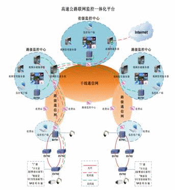 該系統(tǒng)集數(shù)字視頻傳輸、視頻管理、視頻存儲(chǔ)以及外網(wǎng)發(fā)布等功能為一體。 EV701中心設(shè)備有4個(gè)業(yè)務(wù)槽,可任意插拔編解碼卡,最多支持8路視音頻數(shù)據(jù)。采用H.264編碼標(biāo)準(zhǔn)的EV702外場(chǎng)綜合接入設(shè)備,將原來外場(chǎng)分散的攝像頭、快球、云臺(tái)、可變情報(bào)板、報(bào)警感應(yīng)器等設(shè)備融為一體,同時(shí)也支持MPEG編碼標(biāo)準(zhǔn)的視音頻接入?梢酝瑫r(shí)編碼2路以上的視音頻信號(hào),支持雙流傳輸,D1數(shù)據(jù)用于實(shí)時(shí)觀看,CIF數(shù)據(jù)用于存儲(chǔ)和Web網(wǎng)業(yè)務(wù)(包括對(duì)外發(fā)布實(shí)時(shí)圖像和管理人員異地監(jiān)控)。具備IP開關(guān)斷功能,減輕了通信網(wǎng)絡(luò)的壓力。 路級(jí)中心、區(qū)域中心、省級(jí)中心分布式多級(jí)監(jiān)控,由省中心統(tǒng)一設(shè)定權(quán)限,進(jìn)行集中管理。