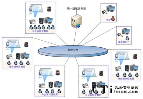 湖南省勞教局是司法廳管理的從事管理、教育、改造勞動教養(yǎng)人員的行政機構(gòu),也是省勞動教養(yǎng)管理委員會的常設(shè)辦事機構(gòu)。其下屬管理有20多個下屬機構(gòu),分布于湖南省各個地市縣,以前進行全局會議時,所有的人員都需要到長沙市來進行開會,管理起來很不方便,同時差旅成本也比較高,同時局里經(jīng)常需要對下面的工作人員進行業(yè)務(wù)方面的培訓(xùn),F(xiàn)客戶需要在他們的勞教專網(wǎng)上部署一套視頻會議系統(tǒng)來進行管理和培訓(xùn)。