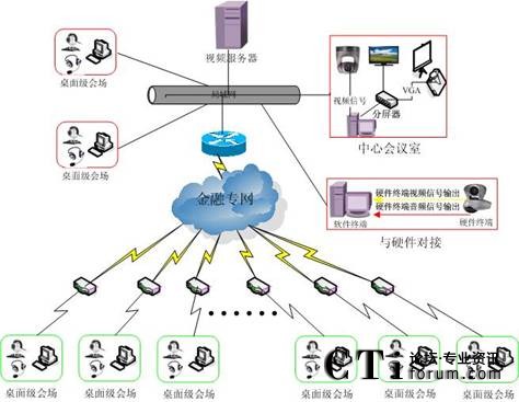 根據(jù)上圖可以知道,在全南縣信用社中心機(jī)房部署一臺(tái)視頻服務(wù)器,這臺(tái)視頻服務(wù)器主要提供各個(gè)會(huì)場(chǎng)進(jìn)行召開會(huì)議訪問,同時(shí)提供遠(yuǎn)程對(duì)系統(tǒng)管理和維護(hù)功能;在全南縣信用社硬件視頻會(huì)議室部署一臺(tái)帶有采集卡PC主機(jī),這臺(tái)PC用和硬件視頻會(huì)議對(duì)接,由硬件視頻會(huì)議提供一路視頻和一路音頻輸出信號(hào),再把硬件提供輸出視頻信號(hào)接入PC主機(jī)上采集卡上,輸出音頻信號(hào)接入PC主機(jī)聲卡麥克風(fēng)上,這樣只要開會(huì)是把這臺(tái)PC主機(jī)訪問視頻服務(wù)器登錄會(huì)議室其它會(huì)場(chǎng)就可以收聽收看到硬件視頻會(huì)議會(huì)內(nèi)容。其它各個(gè)支行和網(wǎng)點(diǎn)會(huì)場(chǎng)通過金融專網(wǎng)訪問視頻服務(wù)器,就可以參加會(huì)議、培訓(xùn)、討論交流問題等功能。