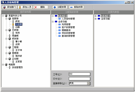 在這一模塊,管理員可以自由設置人員結構、系統(tǒng)權限、客戶權限、查詢權限等;可以根據業(yè)務的需求在數據字典里自行添加報表或字段,并且設定業(yè)務表之間的關聯(lián)性;還可進行工作流的設定與分配,等等。